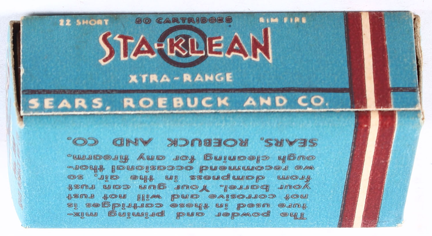 Sears, Sta-Klean, .22 Short, Lead Lubriacted, RHWeb: SEARS-6 S-4c, Full, 1pc. Blue white & maroon box, box is solid with very good to excellent color, some age soiling on top, very minor corner wear, end flaps are solid, ammo is excellent. Grade: Excellent - Value: 20 to 30