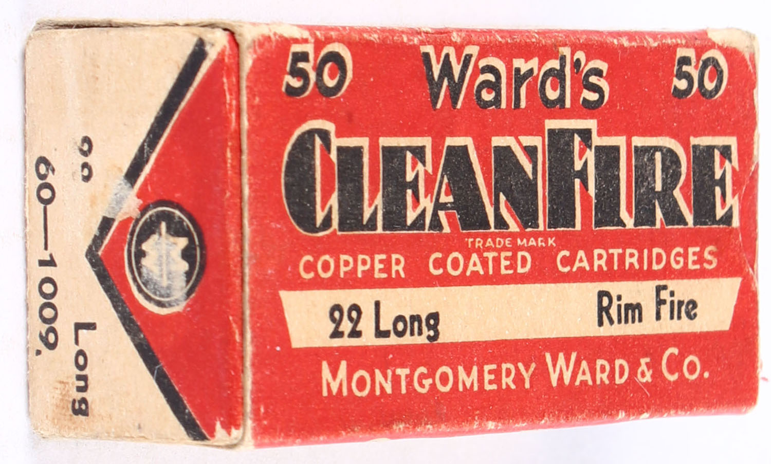 Wards, Cleanfire, .22 Long, Copper Coated, RHWeb: MW-3D L-1, Partial 49rds. 1pc. Red buff & black box, box is solid with very good color, minor age soiling & corner wear, very minor edge wear, end flaps are solid, ammo is excellent. Grade: Very Good ++ - Value: 30 to 45