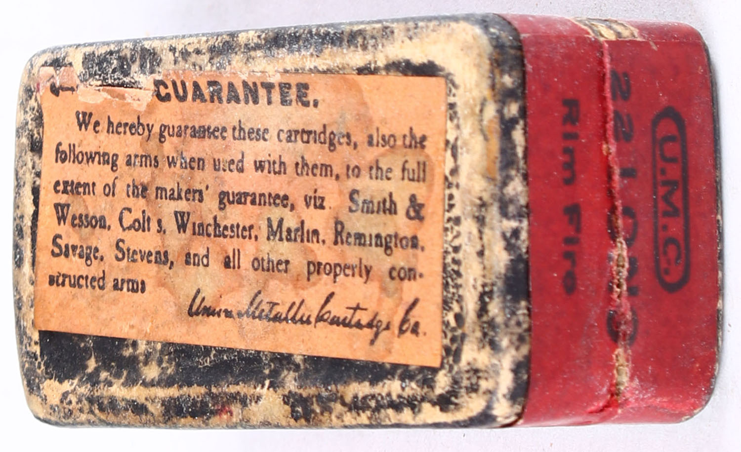 UMC, Rim Fire Cartridges, .22 Long, Swaged Bullet, RHWeb: UMC-8 L-1a, FULL & SEALED*, 2pc. Black mottled box with red top & side sealing labels, box is solid with very good to excellent color, some shelf wear, minor edge & corner wear, label has been unsealed on front side & right end, label is intact. Grade: Very Good + - Value: 80 to 120