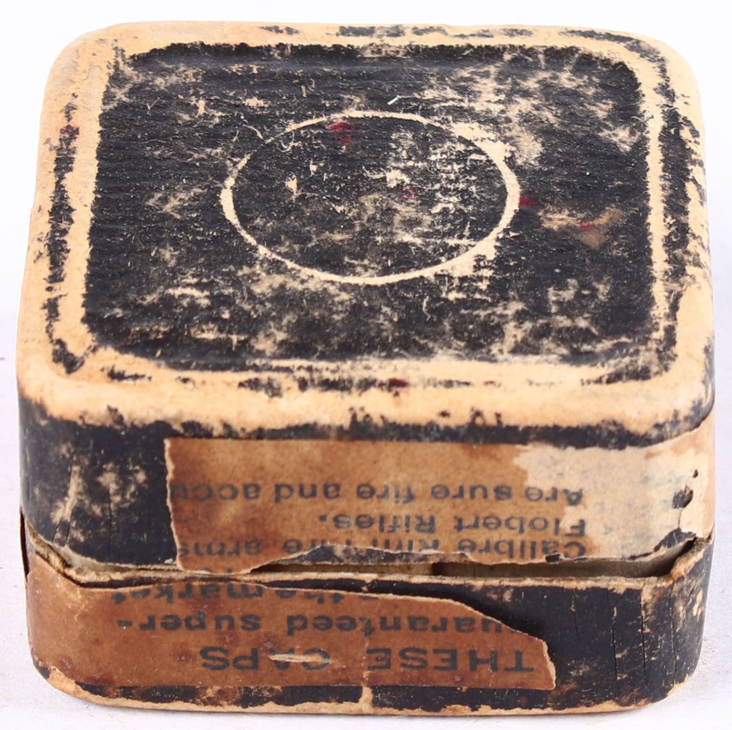 UMC, Smokeless B.B. Caps, RHWeb: UMC-9 BB-1, Partial, approx 2/3 full, 2pc. Black mottled box with buff top & side sealing labels, box is solid with fair color, significant age soiling on top, some edge & corner wear, side sealing label is 80% intact, ammo is very good to excellent. Grade: Good ++ - Value: 20 to 30