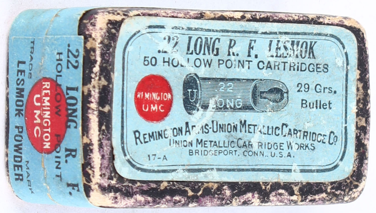 REM-UMC, R.F. Lesmok Cartridges, .22 Long Hollow Point, 29 Grs. Bullet, Full, 2pc. Black mottled box, box is solid with blue top & side sealing labels, box is solid with excellent color, minor shelf & corner wear, very minor edge wear, labels are intact, ammo is good to very good. Grade: Excellent - Value: 80 to 120