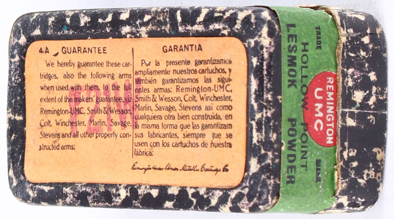 REM-UMC, R.F. Lesmok Cartridges, .22 Long Rifle Hollow Point, 35 Grs. Bullet, RHWeb: REM-2 LR-4B, Full, 2pc. Black mottled box with green top & side sealing labels, box is solid with excellent color, very minor edge & corner wear, side sealing label is 90% intact, ammo is good to very good. Grade: Excellent + - Value: 200 to 300