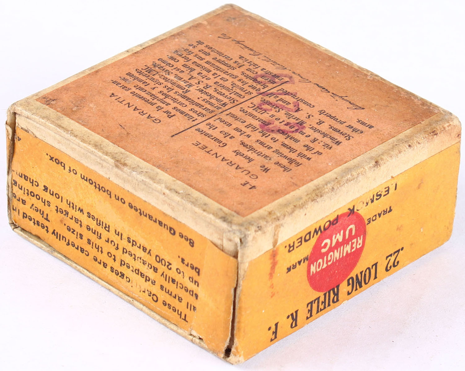 REM-UMC, R.F. Cartridges, .22 Long Rifle, Lesmok Powder, RHWeb: REM-2 LR-7.5A, Partial 80rds. 2pc. Buff box with orange top & side sealing labels, box is solid with very good color, minor age soiling, very minor edge & corner wear, side sealing label is 99% intact, ammo is good. Grade: Very Good + - Value: 100 to 150