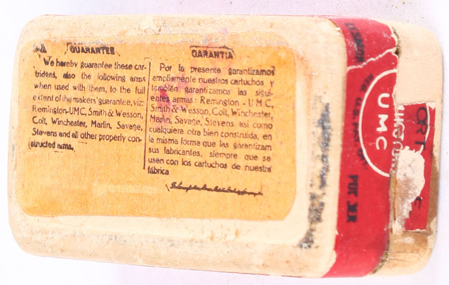 REM-UMC, R.F. Lesmok Cartridges, .22 Short, 29 Grs. Bullet, RHWeb: REM-3 S-2A, Full, 2pc. Buff box with red top & side sealing labels, box is solid with excellent color, minor age soiling & corner wear, very minor edge wear, side sealing label is 95% intact, ammo is good. Grade: Very Good - Value: 20 to 30