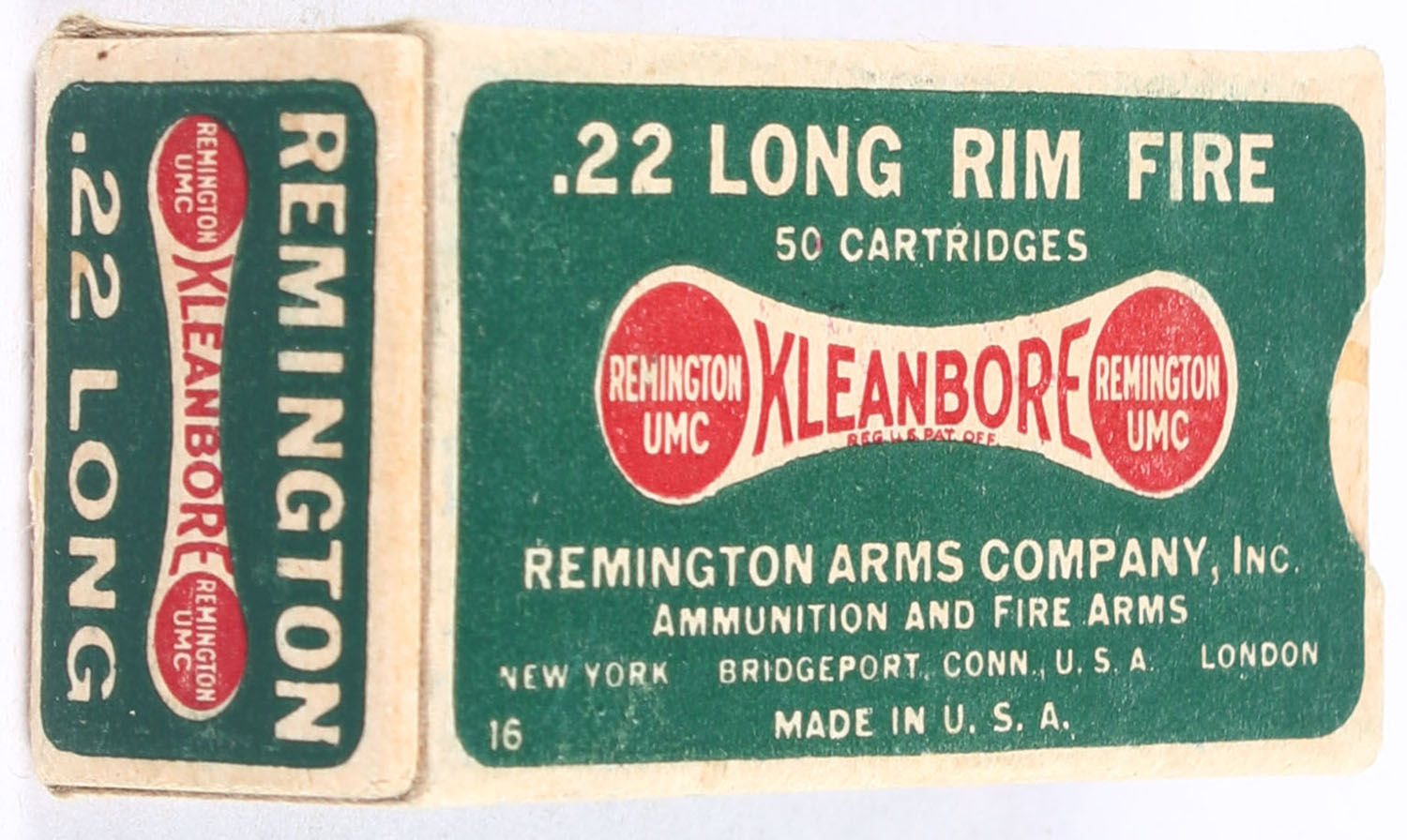Remington, Kleanbore, .22 Long, RHWeb: REM-7.1A, L-1c, Full, 1pc. Green buff & red dog bone box, box is solid with excellent color, very minor age soiling & corner wear, edges are mostly crisp, end flaps are solid, ammo is very good. Grade: Excellent - Value: 40 to 60