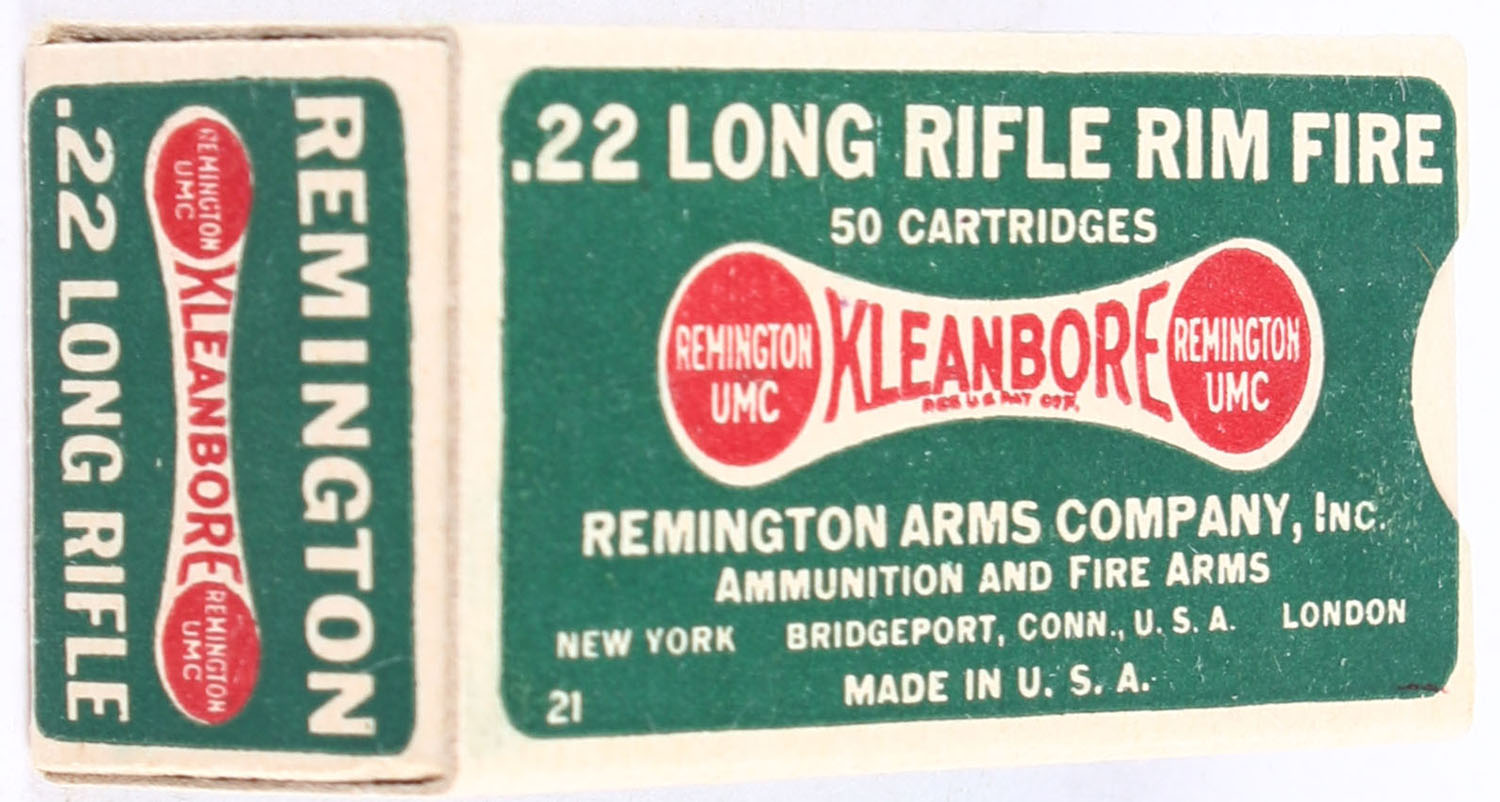 Remington, Kleanbore, .22 Long Rifle, RHWeb: REM-7.1A LR-1aa, Full, 1pc. Green buff & red dog bone box, box is near mint with minty color, only very minor corner wear edges are crisp, end flaps are solid, ammo is excellent. Grade: Excellent ++ - Value: 30 to 45