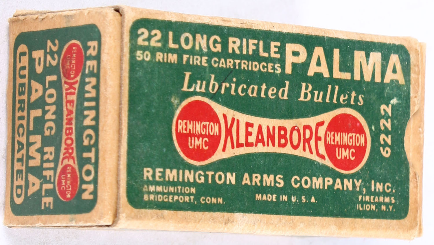 Remington, Palma Kleanbore, .22 Long Rifle, Lubricated, RHWeb: REM-52 LR-13, Full, 1pc. Green buff & red dog bone box, box is solid with very good color, minor age soiling, very minor corner wear, edges are mostly crisp, end flaps are solid, ammo is excellent. Grade: Excellent - Value: 16 to 24