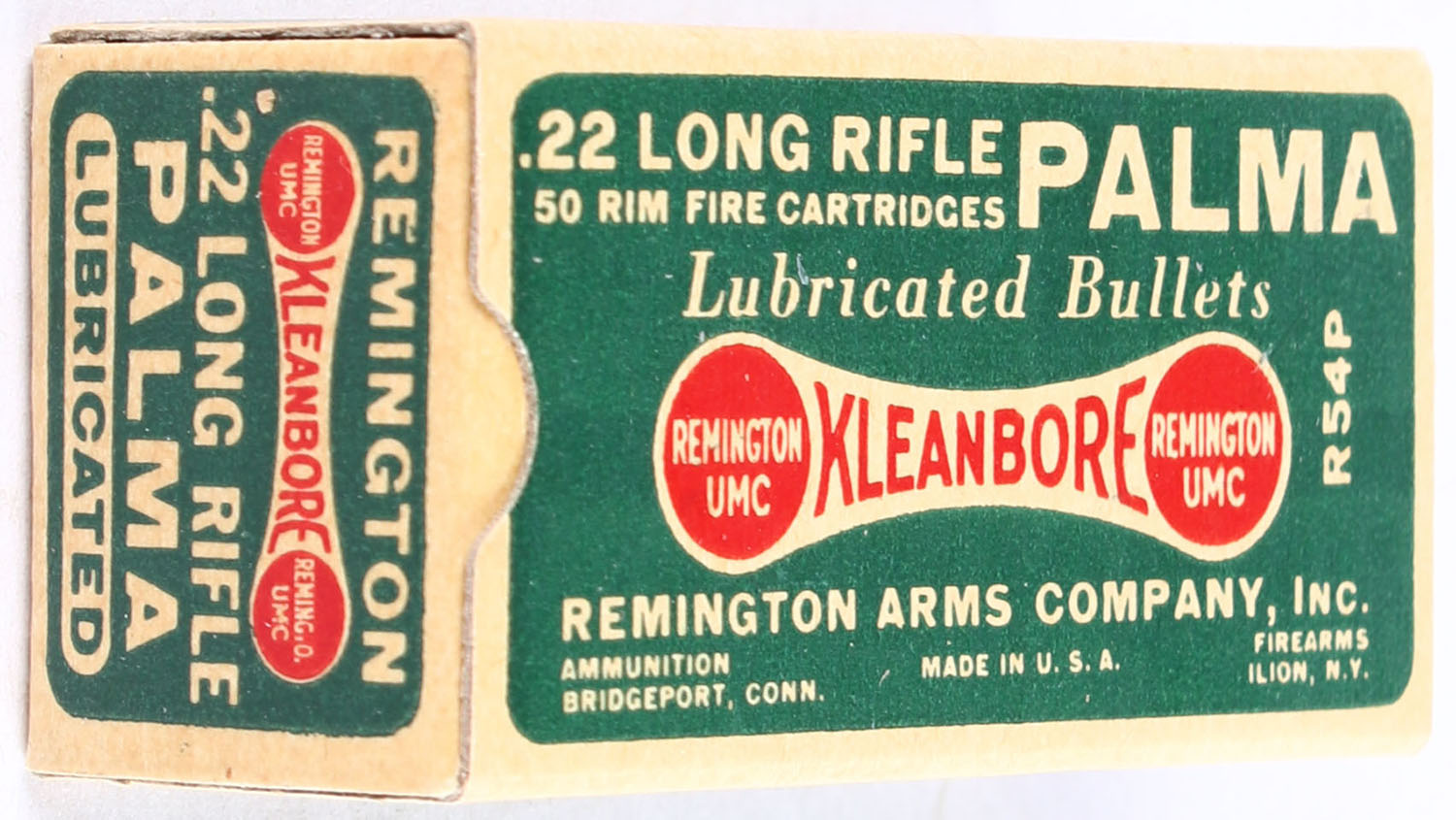 Remington, Palma Kleanbore, .22 Long Rife, Lubricated, RHWeb: REM-52 LR-88a, Full, 1pc. Green buff & red dog bone box, box is near mint with excellent to minty color, only very minor age soiling, corners are mostly sharp, edges are crisp, end flaps are solid, ammo is excellent. Grade: Excellent ++ - Value: 30 to 45