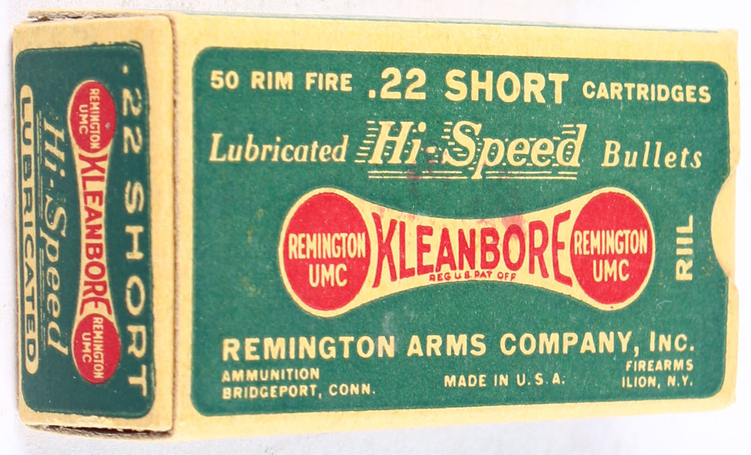 Remington, Hi-Speed Kleanbore, .22 Short, RHWeb: REM-7.4 S-1a, Full, 1pc. Green buff & red dog bone box, box is solid with excellent color, very minor staining on top, corners are mostly sharp, edges are crisp, end flaps are solid, ammo is excellent. Grade: Excellent + - Value: 12 to 18