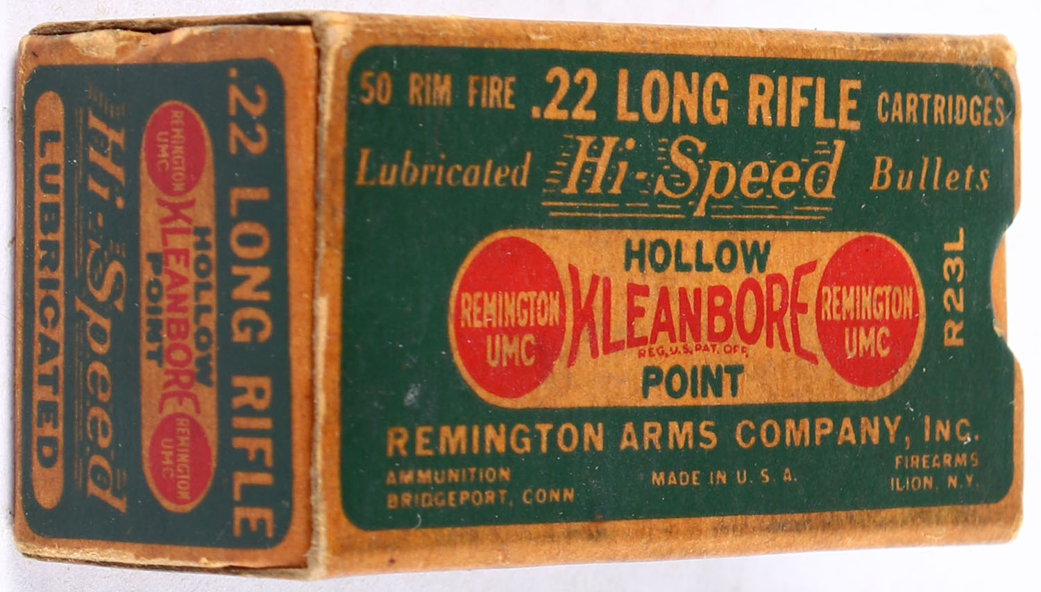 Remington, Hi-Speed Kleanbore, .22 Long Rifle Hollow Point, RHWeb: REM-7.4 LR-3d (only with back IV), 1pc. Green buff & red dog bone box, box is solid with good to very good color, age soiling, minor corner wear, edges are mostly crisp, end flaps are solid, ammo is very good. Grade: Very Good + - Value: 10 to 15