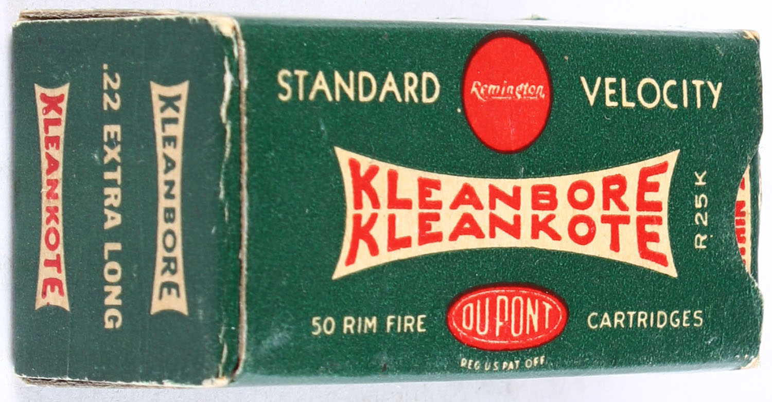 Remington, Kleanbore Kleankote, .22 Extra Long, Standard Velocity, RHWeb: REM-9 XL-1b, Full, 1pc. Green white & red box, box is solid with excellent color, minor corner wear, edges are crisp, end flaps are solid, ammo is excellent. Grade: Excellent + - Value: 160 to 240