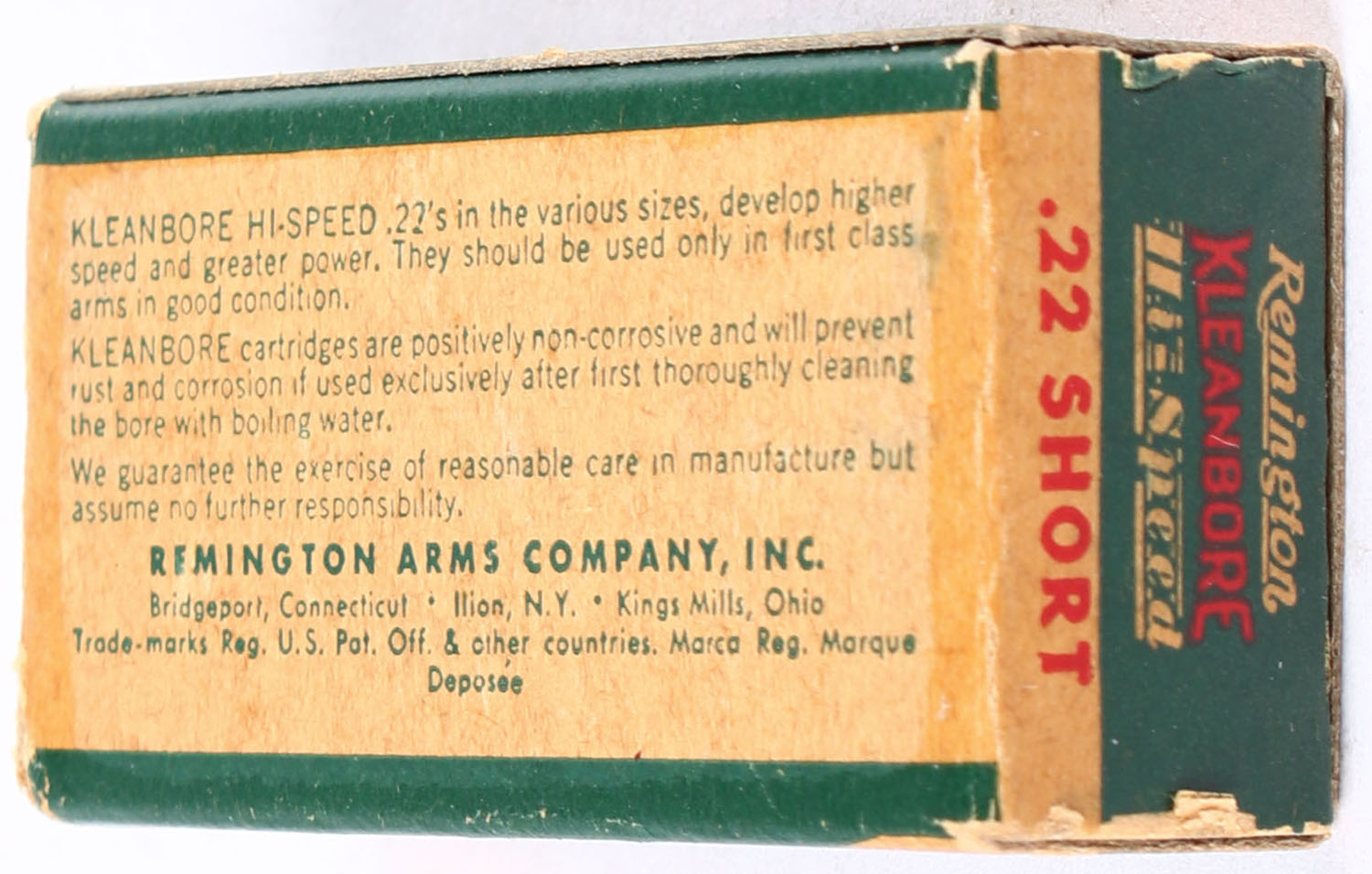 Remington, Kleanbore Hi-Speed, .22 Short Primed Shells, RHWeb: REM-10 S-2, Full, 1pc. Green buff & red box with white ''Primed Shells'' over-label, box is solid with excellent color, very minor corner wear, edges are crisp, end flaps are solid, over-label is intact but is beginning to peel, ammo is minty. Grade: Excellent + - Value: 40 to 60