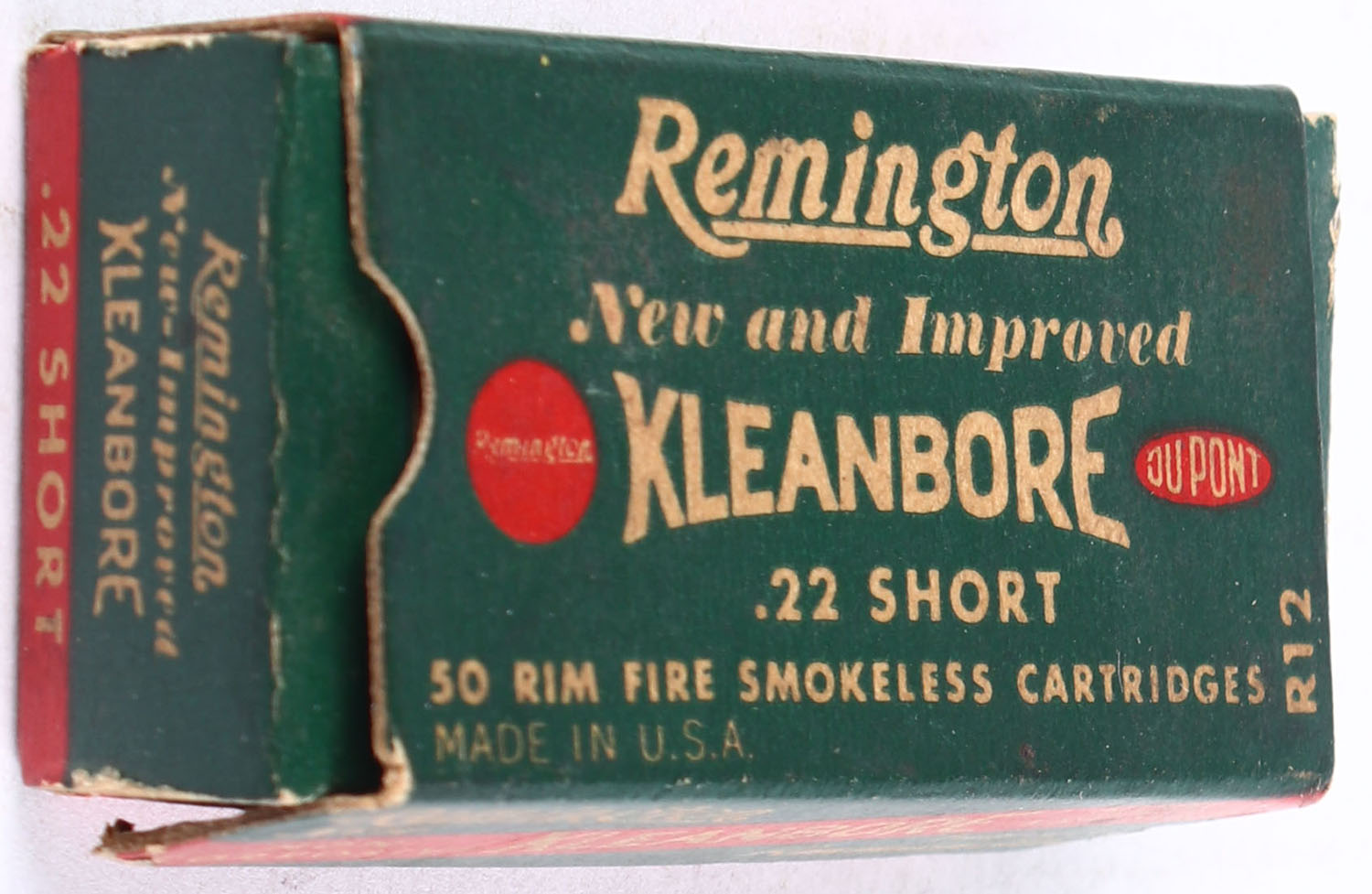 Remington, New and Improved Kleanbore, .22 Short, RHWeb: REM-11 S-1, Full, 1pc. Green buff & red box, box is solid with very good to excellent color, minor age soiling, factory seam has unadhered, minor corner wear, edges are crisp, end flaps are solid, ammo is excellent. Grade: Very Good ++ - Value: 10 to 15