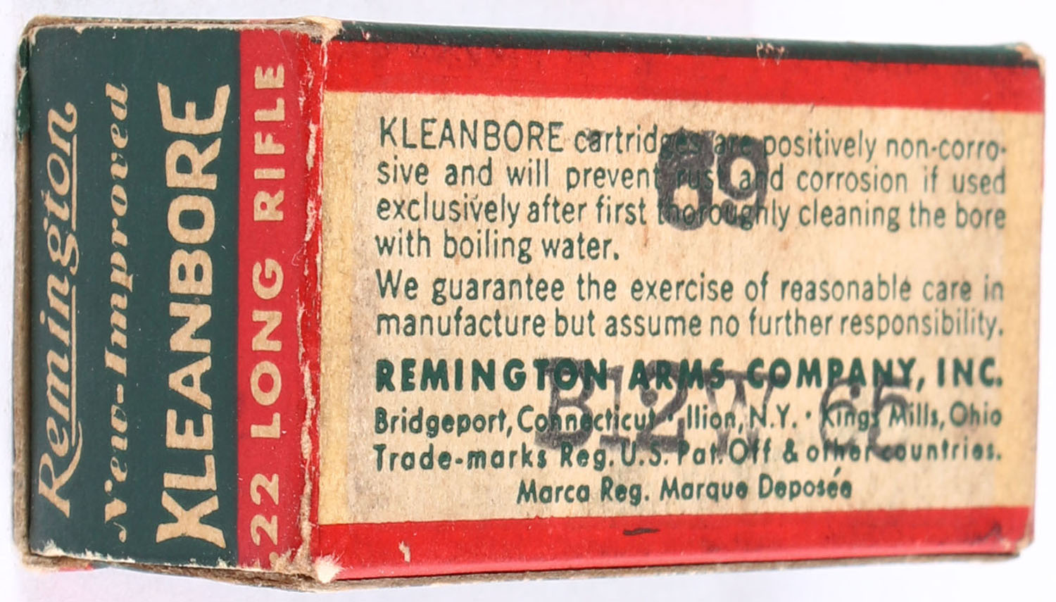 Remington, New and Improved Kleanbore, .22 Long Rifle, RHWeb: REM-11 LR-1, Full, 1pc. Green buff & red box, box is solid with excellent color, very minor age soiling, some corner wear, very minor edge wear, end flaps are solid, ammo is very good. Grade: Very Good ++ - Value: 6 to 10