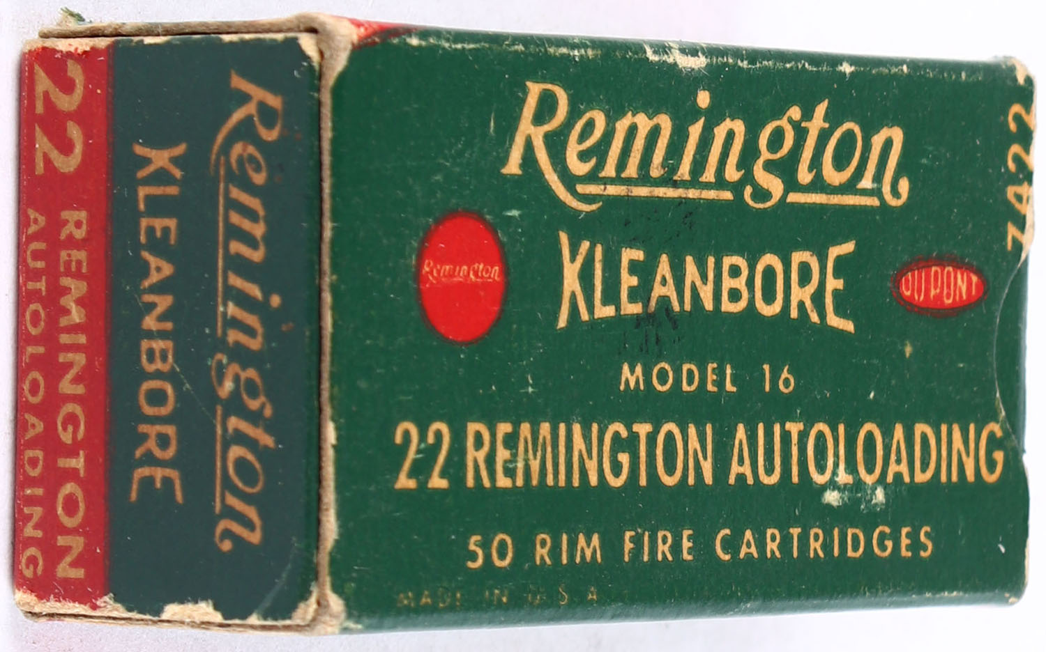 Remington, Kleanbore, .22 Remington Autoloading, RHWeb: REM-12 RA-1b, Full, 1pc. Green white & red box, box is solid with very good color, some age soiling & corner wear, edges are mostly crisp, end flaps are solid, ammo is excellent. Grade: Very Good ++ - Value: 80 to 120
