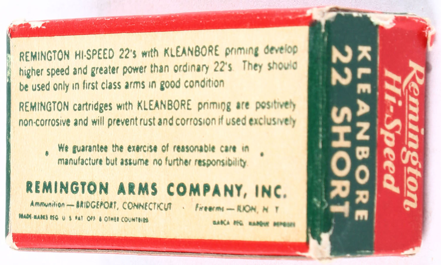Remington, Hi-Speed Kleanbore, .22 Short, RHWeb: REM-14 S-1b, Full, 1pc. Red white & green box, box is solid with excellent color, some corner wear, minor edge wear, end flaps are solid, ammo is excellent to minty. Grade: Excellent - Value: 12 to 18