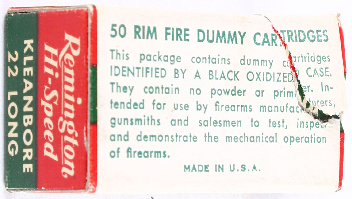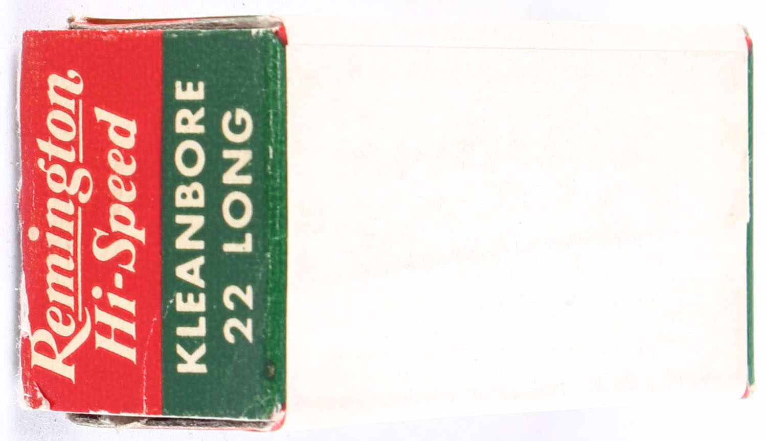 Remington, Hi-Speed Kleanbore, .22 Long Dummy Cartridges, RHWeb: REM-14 L-2, Full, 1pc. Red white & green box with white & green full wrap label, right end flap insert tab is torn, tear on top, excellent color, corners are mostly sharp, edges are crisp, left end flap is solid, ammo is minty. Grade: Very Good ++ - Value: 12 to 18