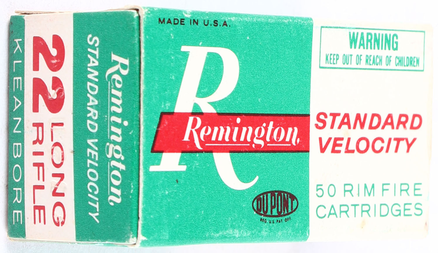 Remington, Standard Velocity, .22 Long Rifle, Kleanbore, Full, 1pc. Green white & red box, box is solid with excellent color, very minor shelf & corner wear, edges are crisp, end flaps are solid, ammo is excellent. Grade: Excellent - Value: 8 to 15