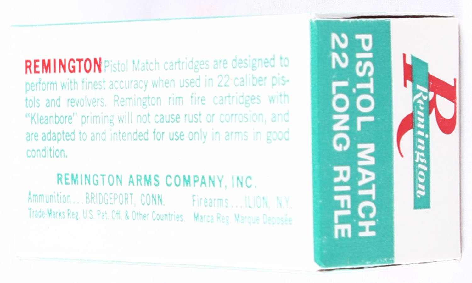 Remington, Pistol Match, .22 Long Rifle, Kleanbore, Full, 1pc. green white & red box, box is solid with excellent color, edges are crisp, end flaps are solid, ammo is excellent. Grade: Excellent ++ - Value: 8 to 15