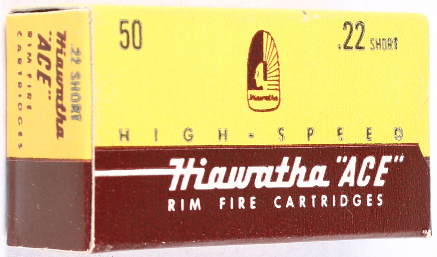 Gambles, Hiawatha ''ACE'', .22 Short, RHWeb: GS-2 S-1, Full, 1pc., yellow brown & white box, box is solid with near mint colors & condition, end flaps are solid, ammo is excellent. Grade: Excellent ++ - Value: 10 to 40