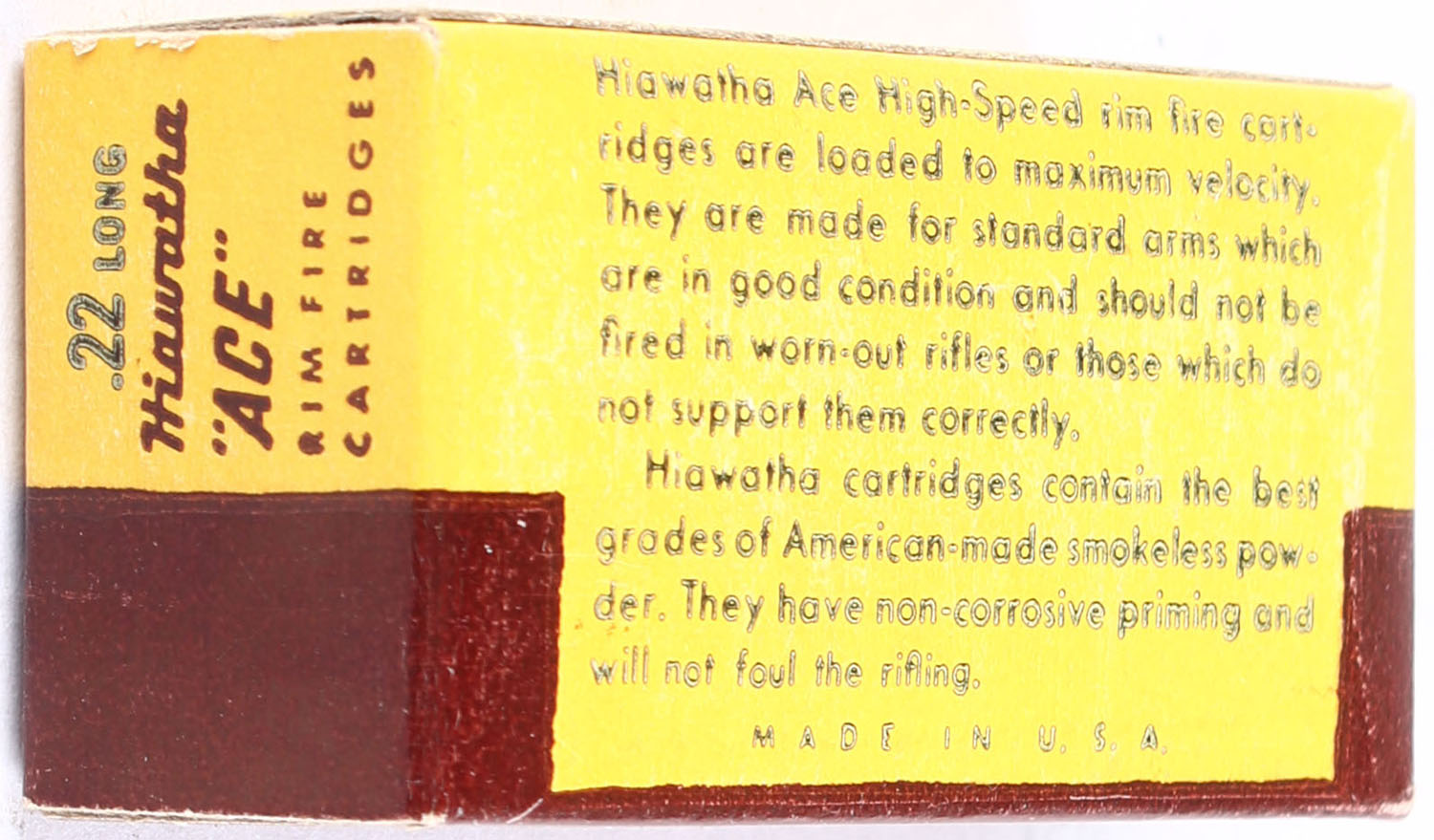 Gambles, Hiawatha ''ACE'', .22 Long, RHWeb: GS-2 L-1, Full, 1pc., yellow brown & white box, box is solid with near mint colors & condition, end flaps are solid, ammo is excellent. Grade: Excellent ++ - Value: 10 to 40