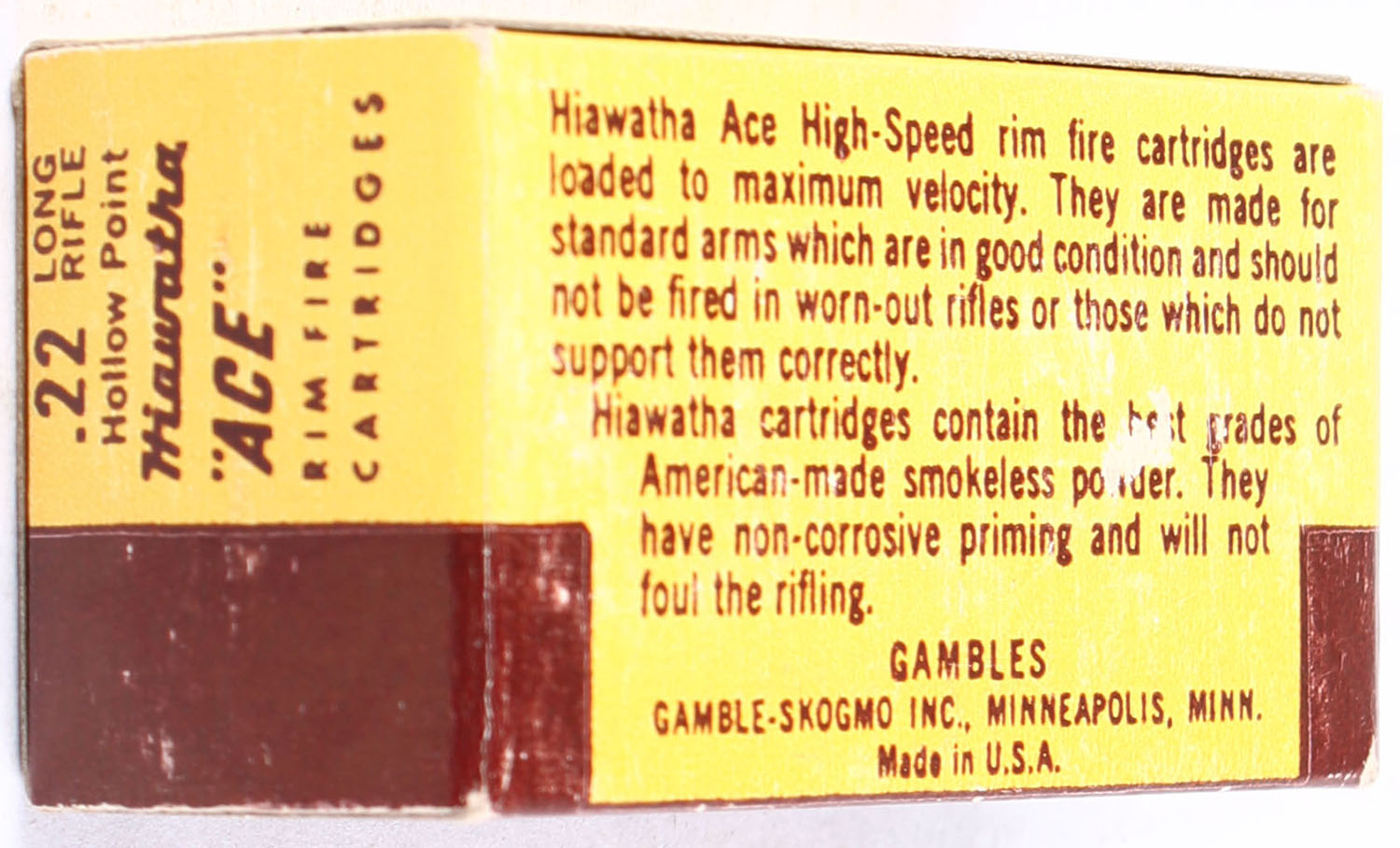 Gambles, Hiawatha ''ACE'', .22 Long Rifle Hollow Point, with warning, RHWeb: GS-4 LR-2, Full, 1pc., yellow brown & white box, box is solid with near mint colors & condition, end flaps are solid, ammo is excellent. Grade: Excellent ++ - Value: 10 to 40