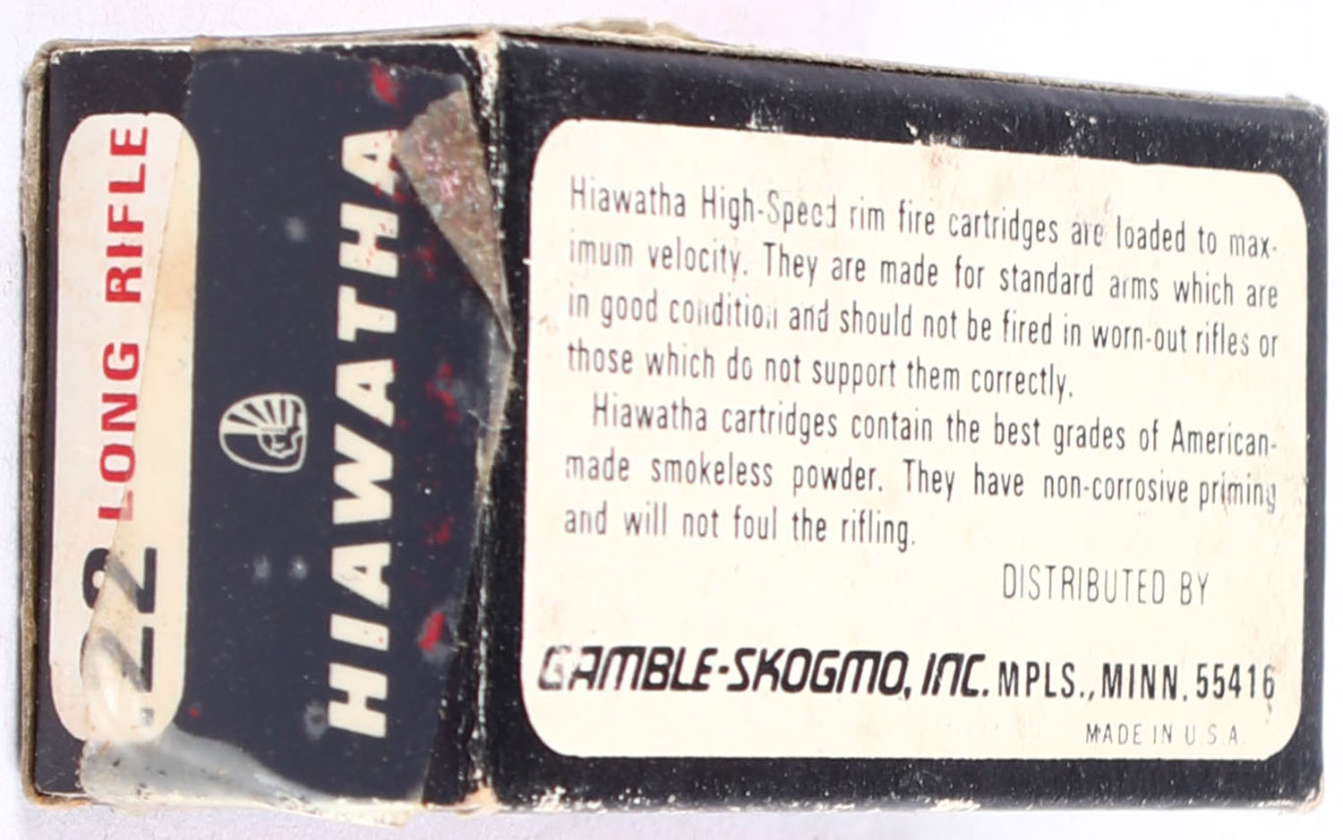 Gambles, Hiawatha, .22 Long Rifle, RHWeb: GS-5 LR-1c, Full, 1pc., white black & red box, box has tape to sides with nice color, edges are crisp, end flaps are solid, ammo is excellent to minty. Grade: Excellent - Value: 30 to 100