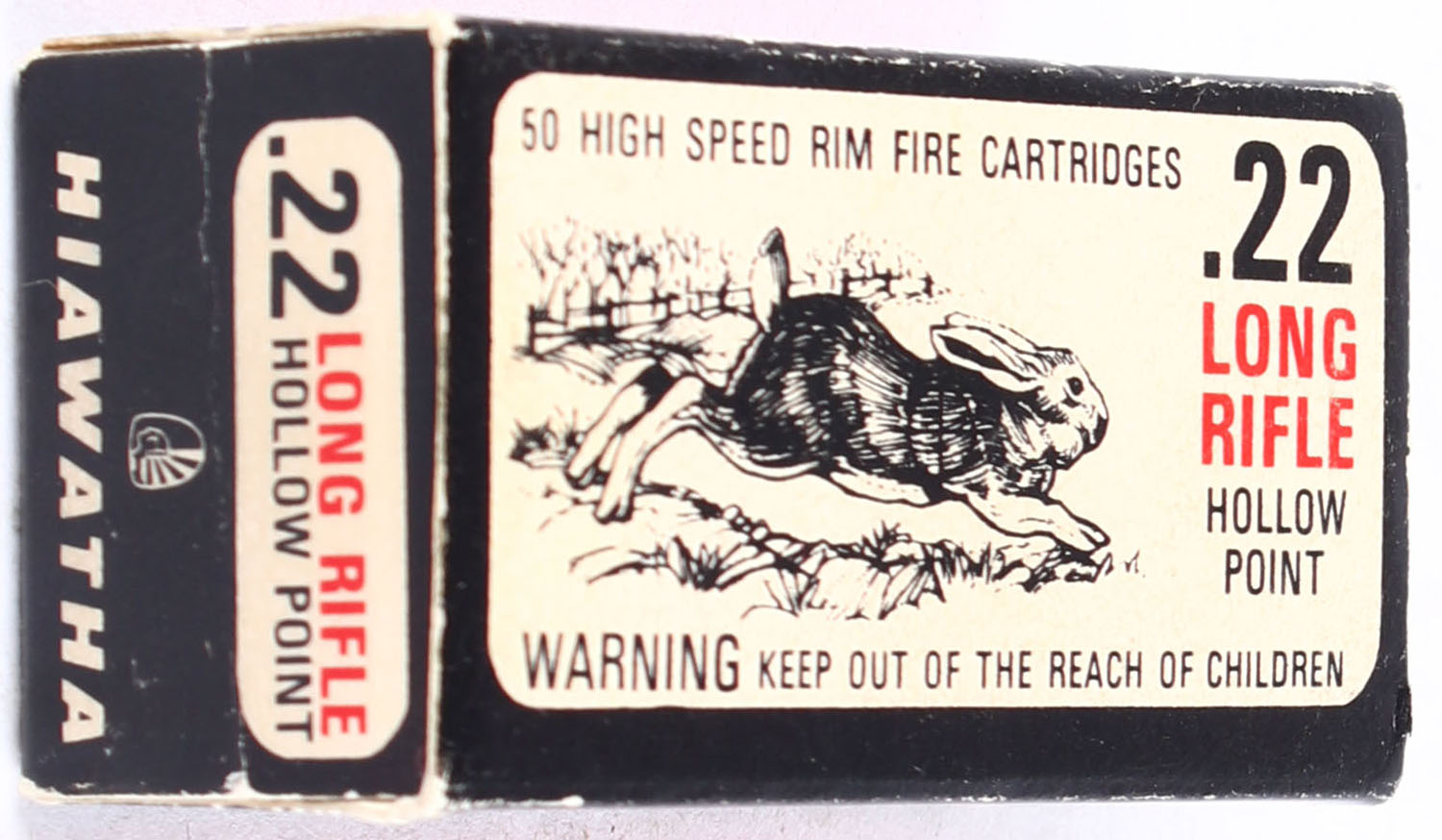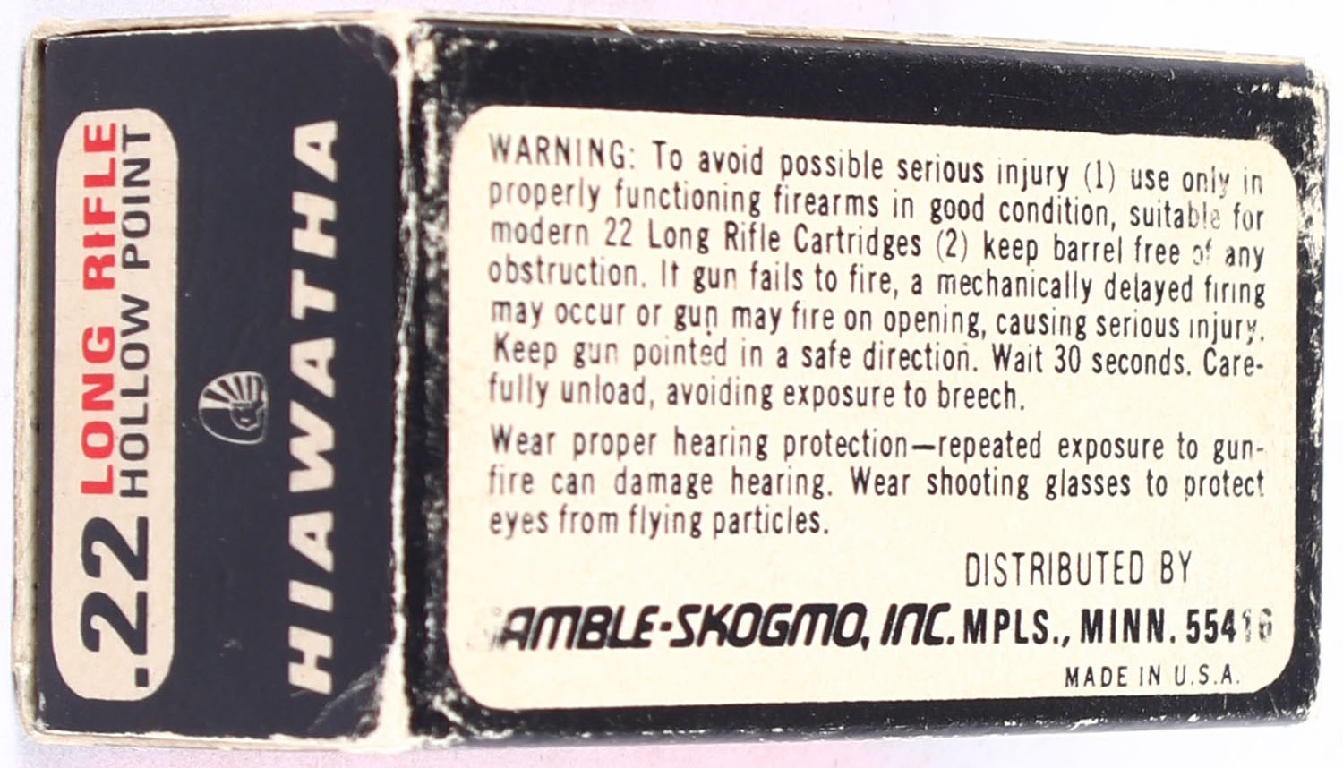 Gambles, Hiawatha, .22 Long Rifle Hollow Point, RHWeb: GS-5 LR-2b, Full, 1pc., white black & red box, box is solid with very nice color, edges are crisp, end flaps are solid, ammo is excellent to minty. Grade: Excellent + - Value: 50 to 300