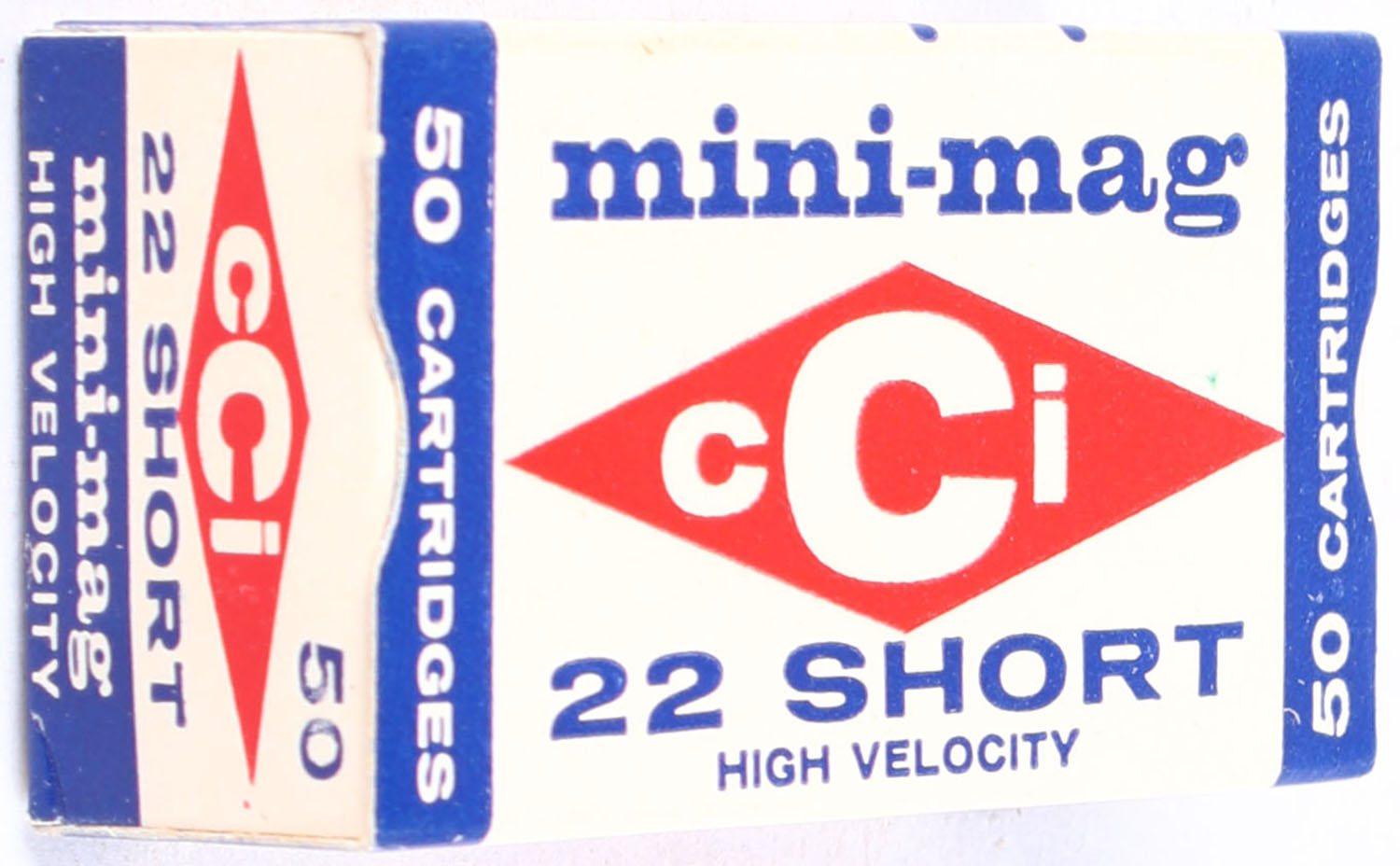 CCi, mini-mag, .22 Short, RHWeb: CCI-1 S-5a, Full, 1pc. White blue & red box, box is solid with minty color, very minor corner wear, edges are crisp, end flaps are rigid, ammo is minty. Grade: Excellent ++ - Value: 6 to 12