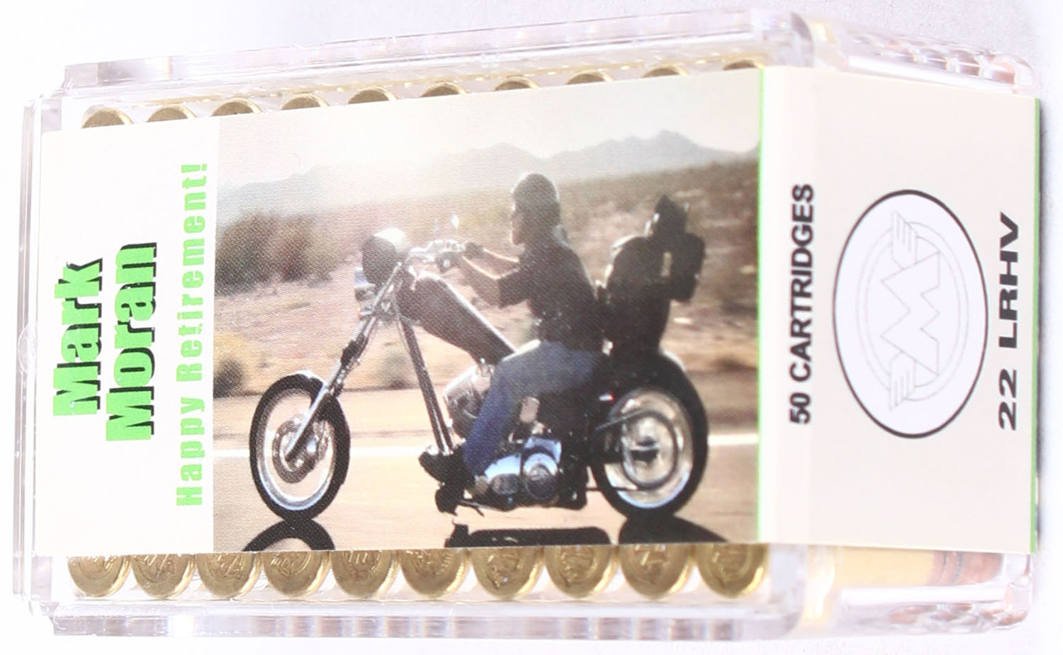 CCi, Mark Moran Commemorative box, .22 Long Rifle High Velocity, 2pc. Clear plastic tray with printed ''fabric'' style label, box is mint, tray is clear, label has minty color. Grade: MINT - Value: 50 to 150