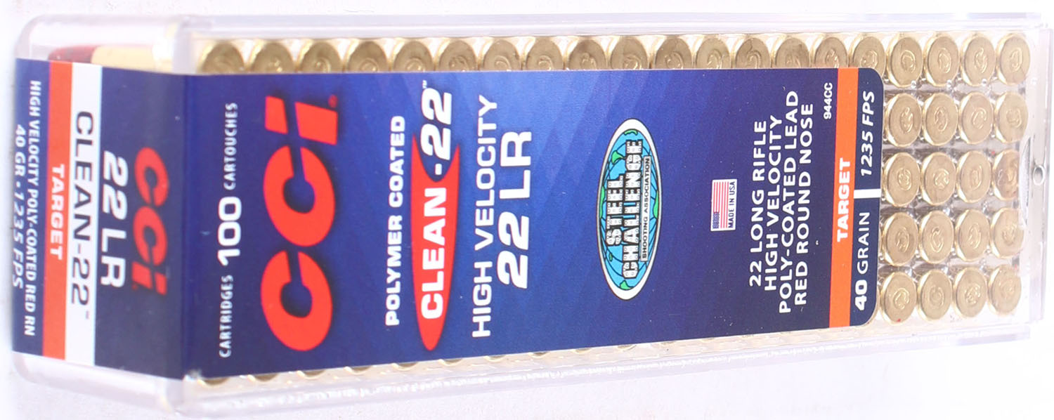 CCi, Clean-22, .22 Long Rifle, High Velocity, 40 Grain Poly-Coated Lead Round Nose, 1235 FPS, FULL & SEALED, 2pc. Clear plastic tray with blue sealing label, box is MINT with minty color, label is intact, ammo appears minty. Grade: MINT - Value: 16 to 24