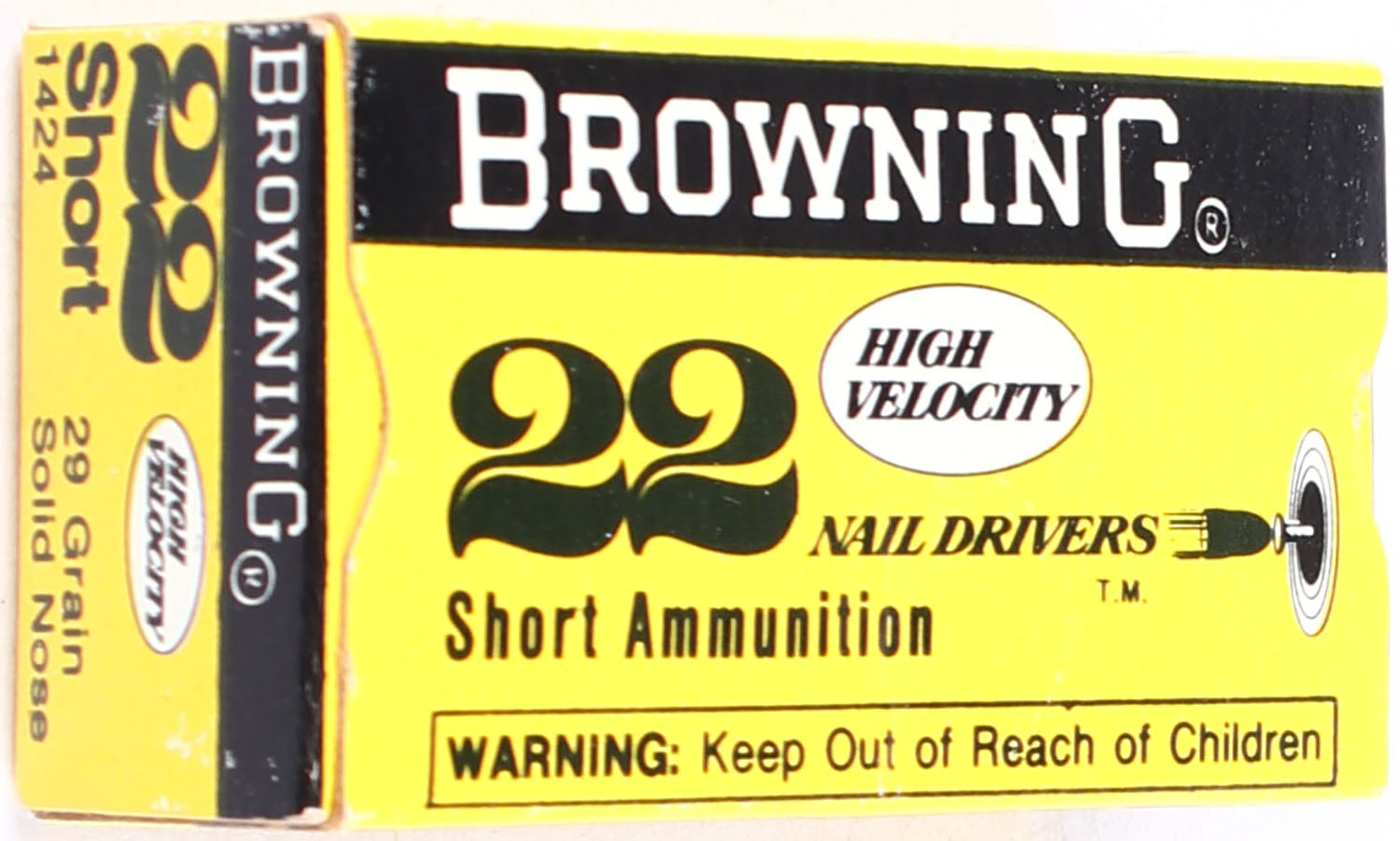 Browning, Nail Drivers, .22 Short, High Velocity, RHWeb: BROWN-1 S-1, Full, 1pc. Yellow black & white box, box is MINT with minty color, corners are sharp, edges are crisp, end flaps are solid, ammo is minty. Grade: MINT - Value: 80 to 120