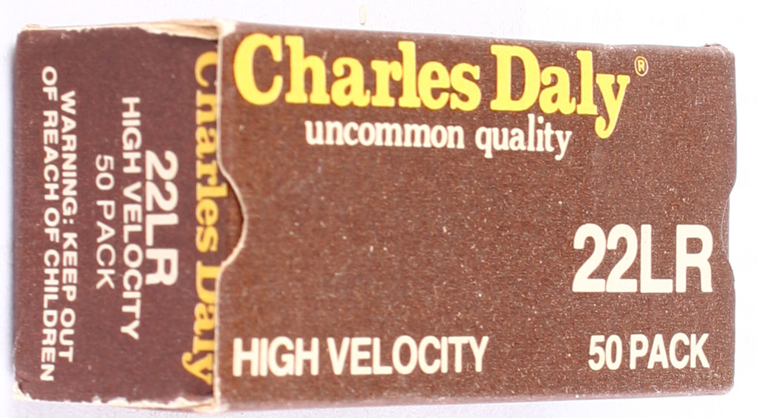 Outdoor Sports Headquarters, Charles Daly, .22 Long Rifle, High Velocity, RHWeb: OSH-1 LR-1, Full, 1pc. Brown white & orange box, box is solid with excellent color, very minor age soiling & corner wear, edges are mostly crisp, end flaps are solid, ammo is excellent. Grade: Excellent + - Value: 8 to 12