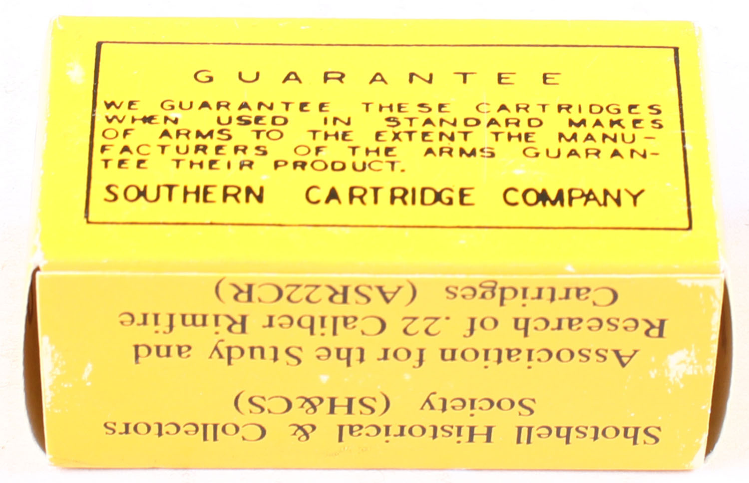 SECCA, Southern Cartridge Company, .22 Long Rifle, RHWeb: SECCA-2 1995, Full, 1pc. Yellow & black box, box is MINT with minty color, corners are sharp, edges are crisp, end flaps are solid, ammo is mint. Grade: MINT - Value: 40 to 60