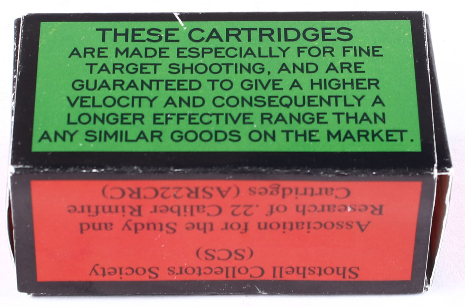 SECCA, Union Cap & Chemical, .22 Long Rifle, RHWeb: SECCA-2 2002, Full, 1pc. Green red & black box, box is near mint with minty color, only very minor corner wear, edges are crisp, end flaps are solid, ammo is minty. Grade: Excellent ++ - Value: 40 to 60