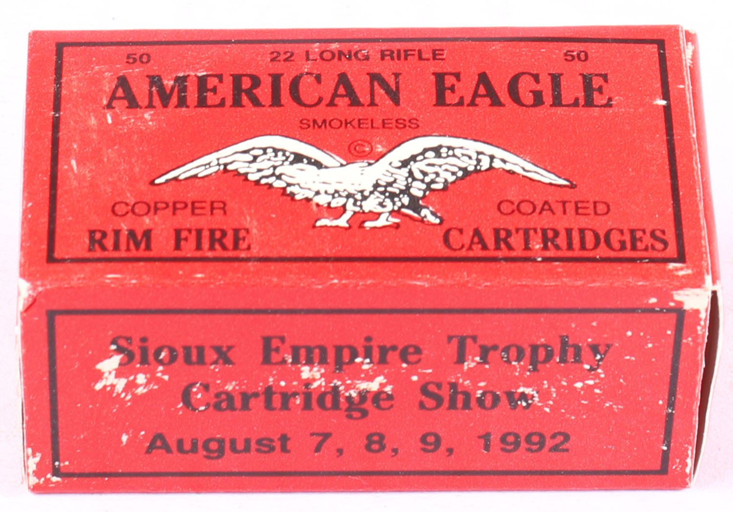 SECCA, Federal American Eagle, .22 Long Rifle, RHWeb: SECCA-2 1992, Full, 1pc. Red black & white box, box is solid with excellent to minty color, some shelf wear, very minor corner wear, edges are crisp, end flaps are solid, ammo is minty. Grade: Excellent - Value: 16 to 24