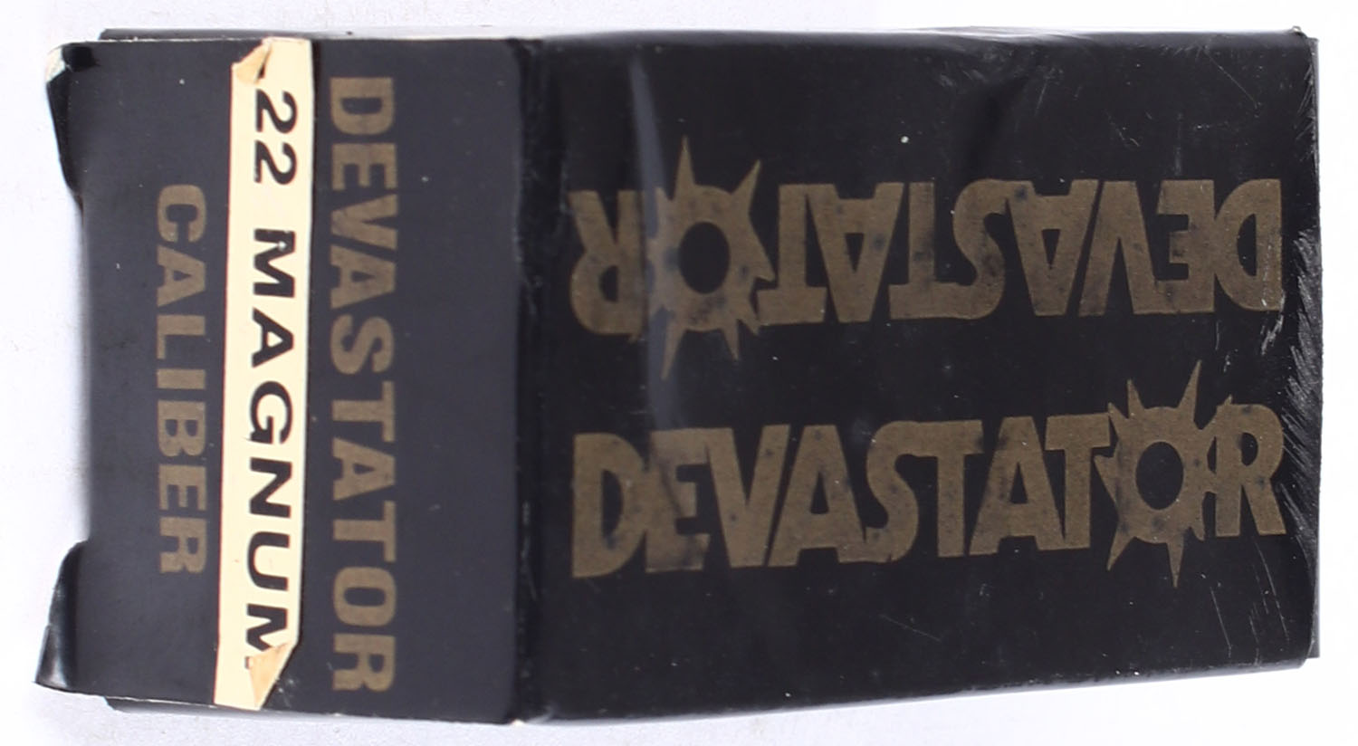 Bingham, Devastator, .22 Magnum, RHWeb: BING-1 WMR-1, Full, 1pc. Black box with gold printing, box is near mint with minty color, very minor corner wear, edges are mostly crisp, end flaps are solid, ammo is very good. Grade: Excellent ++ - Value: 24 to 36