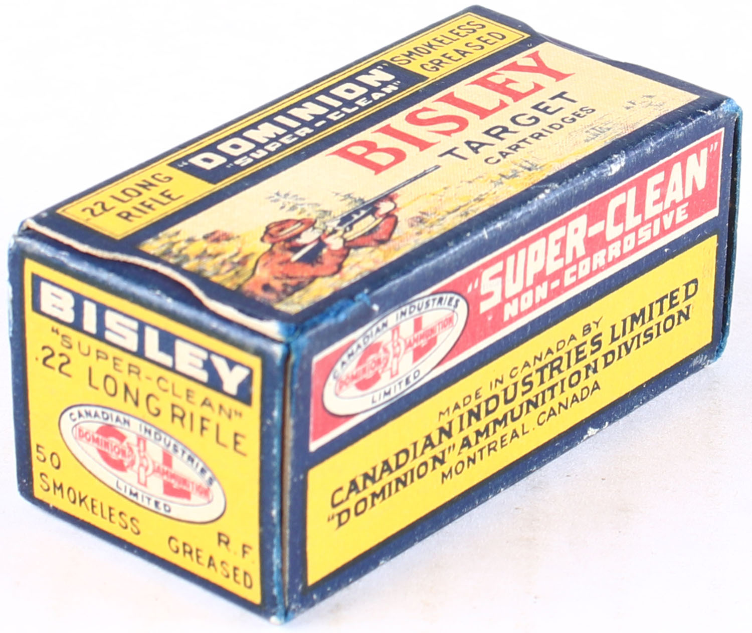C.I.L., Bisley Target, .22 Long Rifle, RHWeb: CIL-2 LR-15b, Full, 1pc. Multicolored box, box is solid with excellent color, very minor edge & corner wear, end flaps are solid, ammo is very good. Grade: Excellent + - Value: 150 to 225