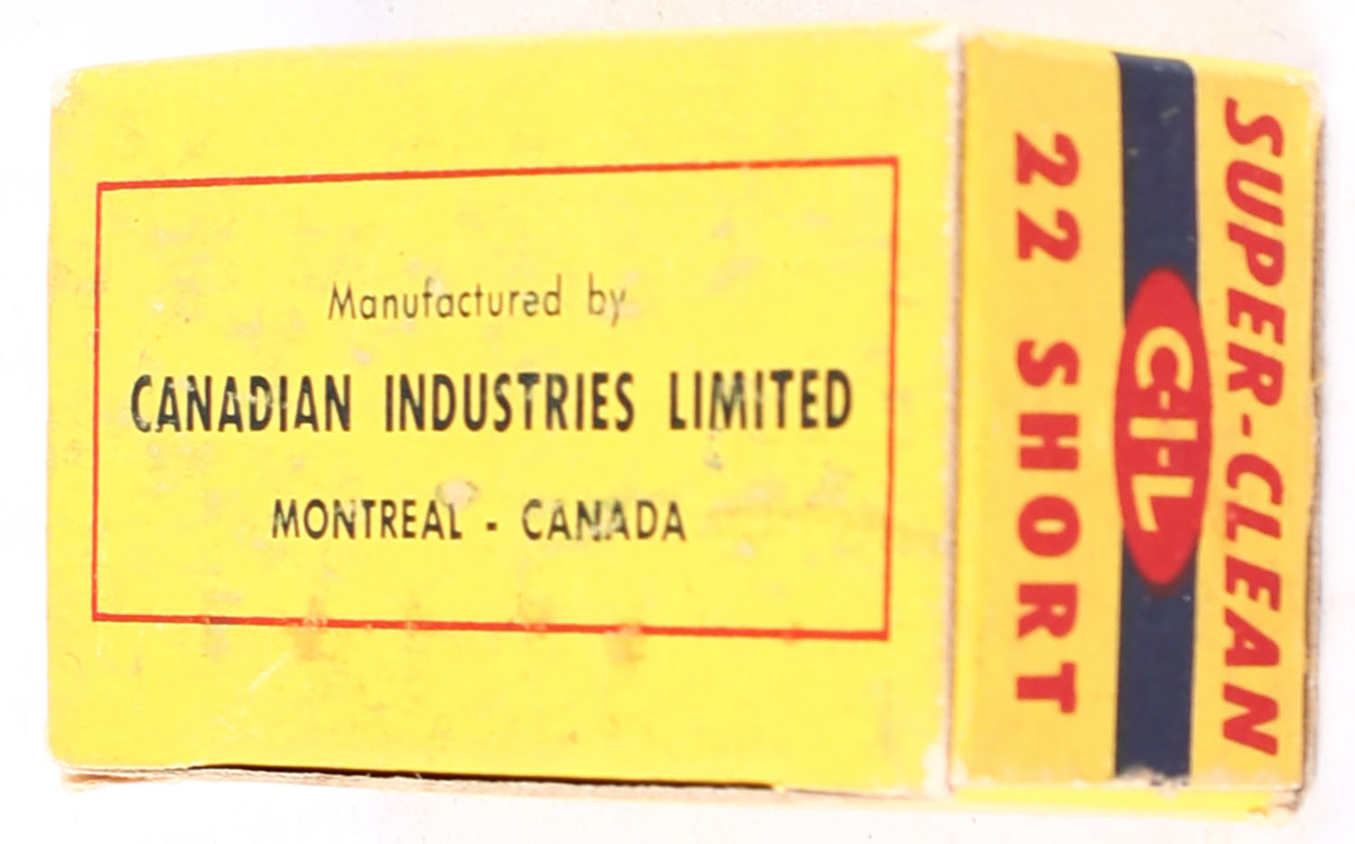 C.I.L., Super-Clean, .22 Short, Standard Velocity, Dry Lubricated, RHWeb: CIL-3 S-3f, Partial 47rds. 1pc. Yellow blue & red box, box is solid with very good color, some shelf wear, tear to top left edge, minor corner wear, edges are mostly crisp, top flap is solid, ammo is excellent. Grade: Very Good - Value: 8 to 12
