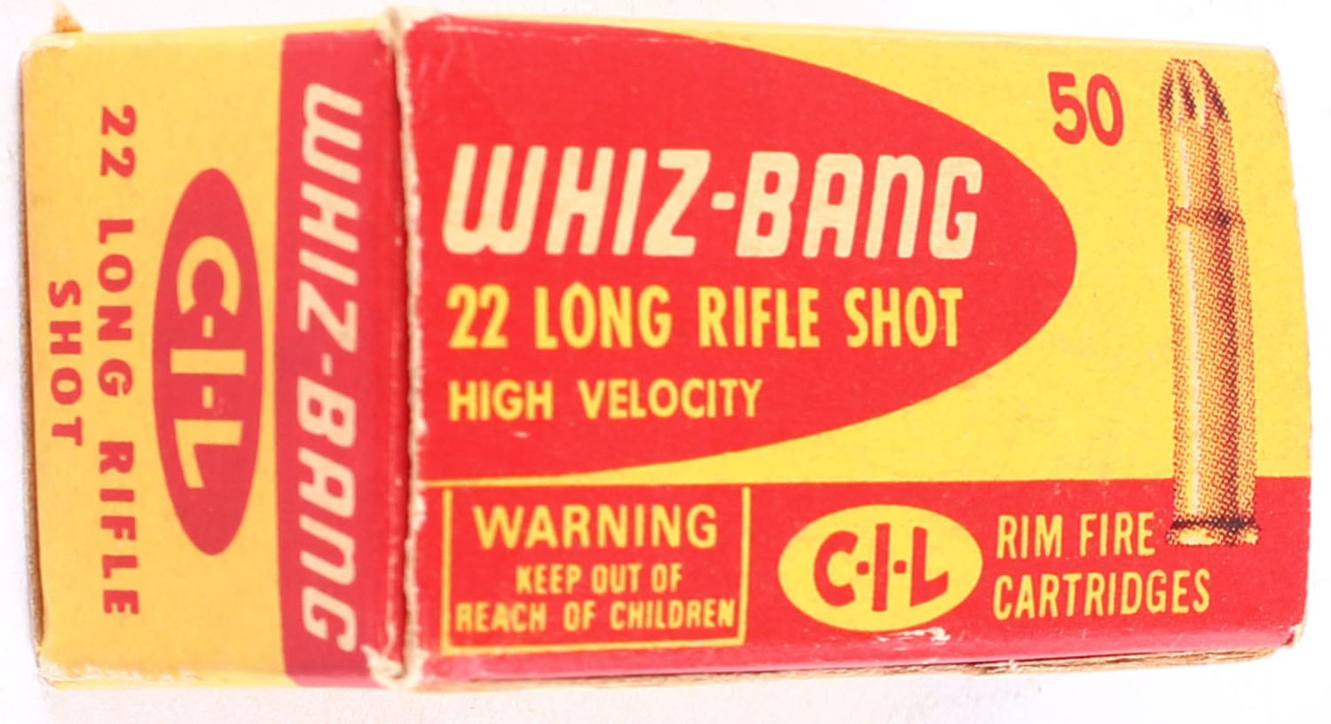 C.I.L., Whiz-Bang, .22 Long Rifle Shot, High Velocity, RHWeb: CIL-6 LR-4, Full, 1pc. Yellow & red box, box is solid with excellent color, very minor age soiling & corner wear, edges are crisp, top flap is solid, ammo is excellent to minty. Grade: Excellent ++ - Value: 50 to 75