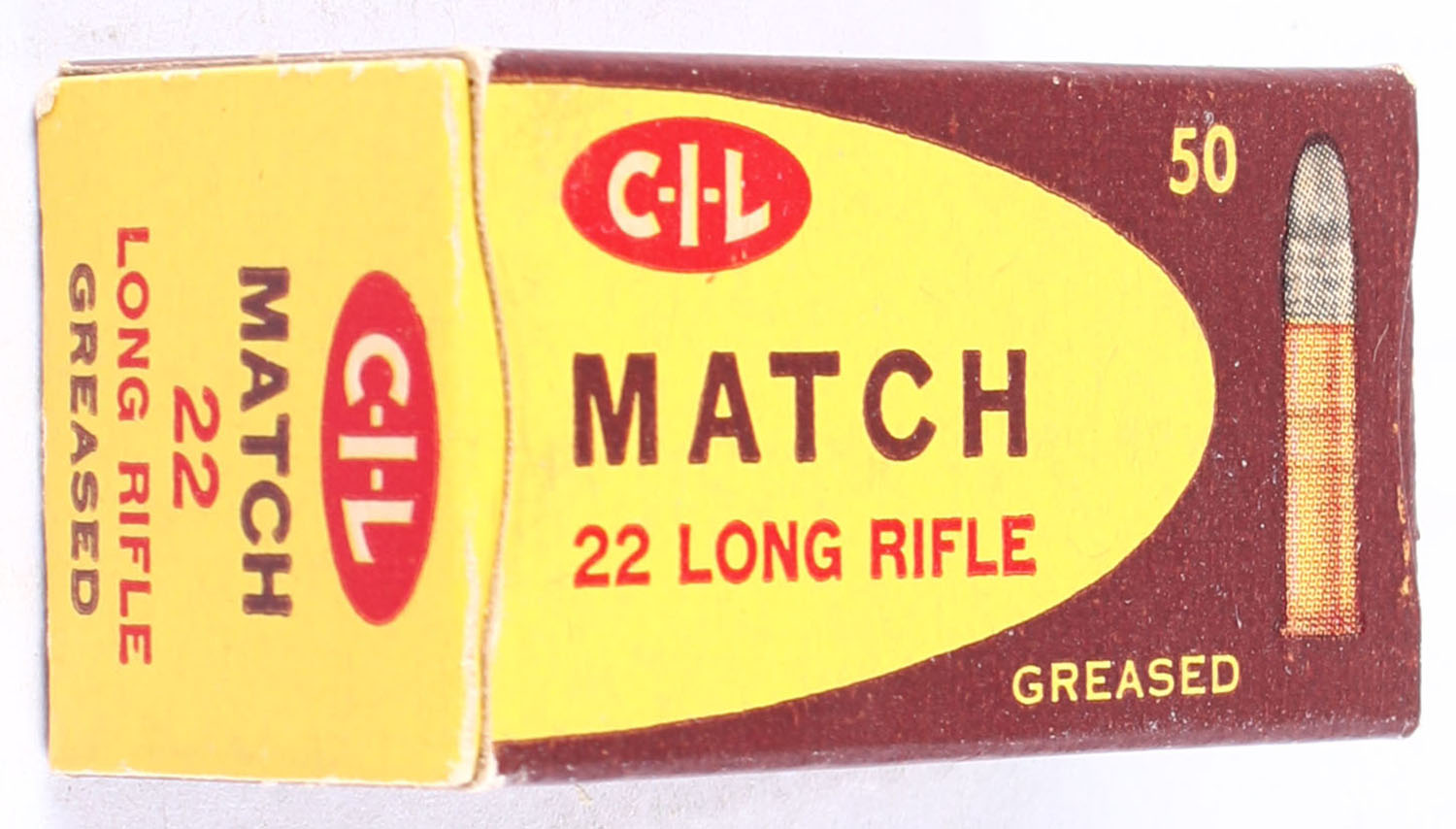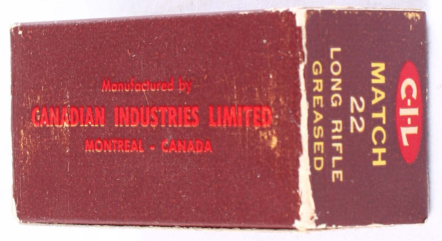 C.I.L., Match, .22 Long Rifle, Greased, RHWeb: CIL-5 LR-5, Full, 1pc. Brown & yellow box, box is solid with excellent color, very minor age soiling & corner wear, edges are crisp, end flaps are solid, ammo is very good to excellent. Grade: Excellent + - Value: 6 to 10