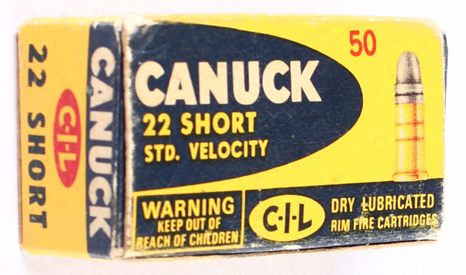 C.I.L., Canuck, .22 Short, Standard Velocity, Dry Lubricated, RHWeb: CIL-6 S-3, Full, 1pc. Yellow & blue box, box is solid with excellent color, some edge & corner wear, top flap is solid, ammo is excellent. Grade: Very Good ++ - Value: 6 to 10