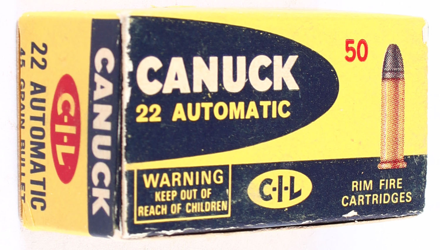 C.I.L., Canuck, .22 Winchester Automatic, 45 Grain Bullet, RHWeb: CIL-6 WA-1, Full, 1pc. Yellow & blue box, box is solid with excellent color, minor edge & corner wear, top flap is solid, ammo is minty. Grade: Excellent - Value: 30 to 45
