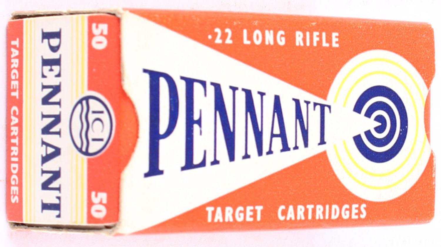 ICI, Pennant, .22 Long Rifle, Target Cartridges, RHWeb: (Australia) PENN-1 LR-1a, (except orange, not red), Full, 1pc. Orange white & yellow box, box is near mint with minty color, only very minor shelf wear, corners are mostly sharp, edges are crisp, end flaps are solid, ammo is excellent. Grade: Excellent ++ - Value: 12 to 18