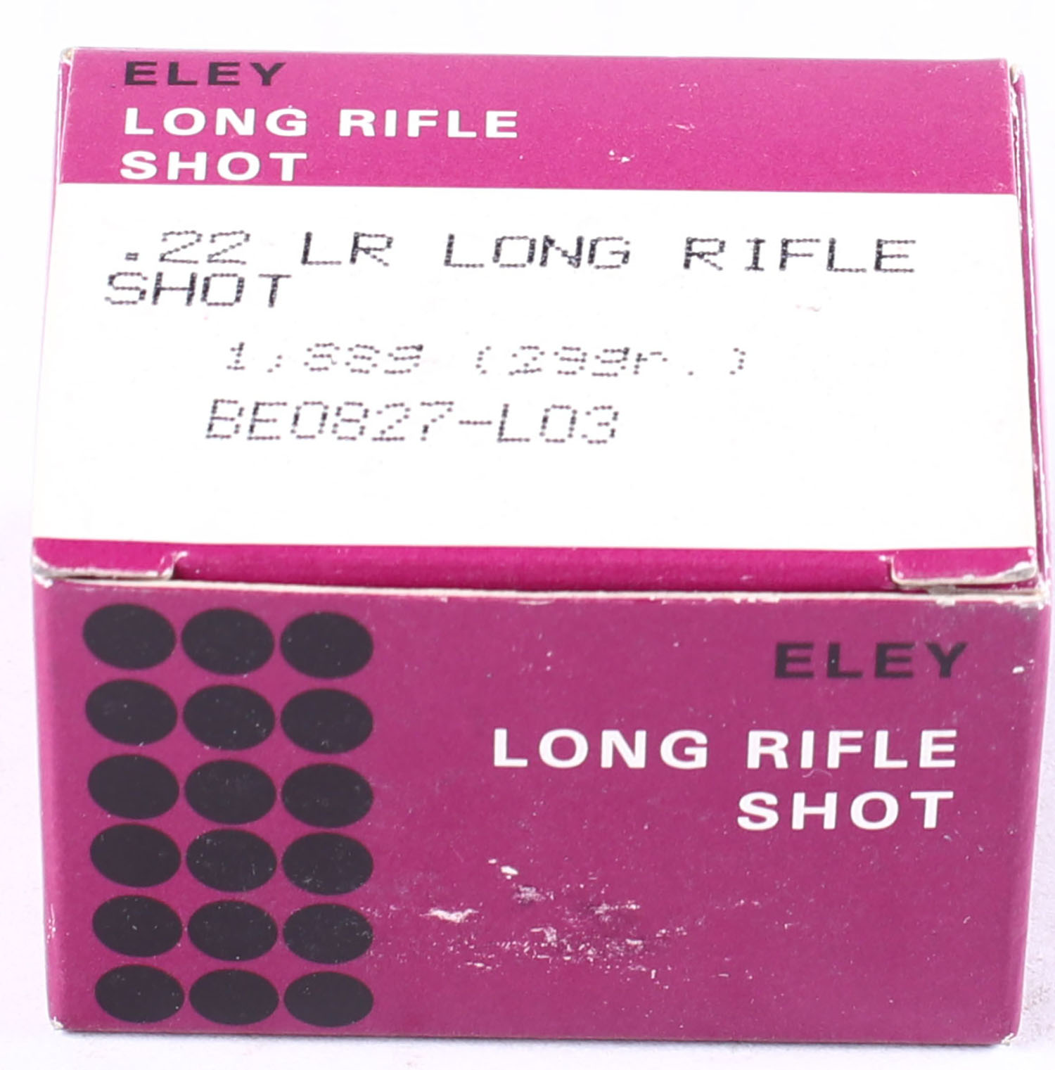 Eley, .22 Long Rifle Shot, RHWeb: (Brazil) CB-4 LR-1, Full, 1pc. Purple white & black box, box is near mint with minty color, only minor shelf wear, corners are mostly sharp, edges are crisp, top flap is solid, ammo is minty. Grade: Excellent ++ - Value: 20 to 30