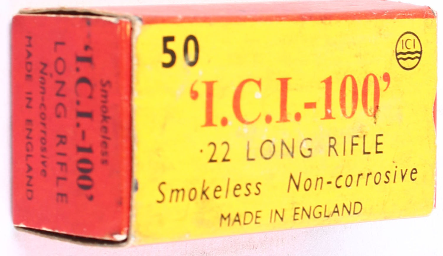 ICI, I.C.I ''100'', .22 Long Rifle, Target Cartridges, RHWEB: (England) ICI-4 LR-2, Partial 30rds. 1pc. Yellow & red box, box is solid with very good color, some age soiling, very minor corner wear, edges are crisp, end flaps are solid, ammo is very good. Grade: Very Good + - Value: 2 to 10