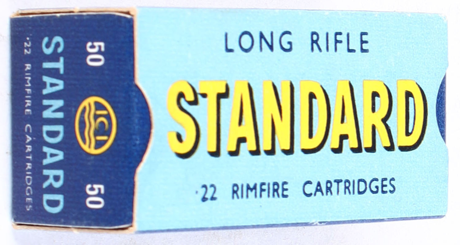 ICI, Standard, .22 Long Rifle, Standard Velocity, RHWEB: (Australia) STD-1 LR-1a, Full, 1pc. Blue & yellow box, box is near mint with minty color, only very minor edge wear, corners are sharp, edges are crisp, end flaps are solid, ammo is excellent. Grade: Excellent ++ - Value: 20 to 30