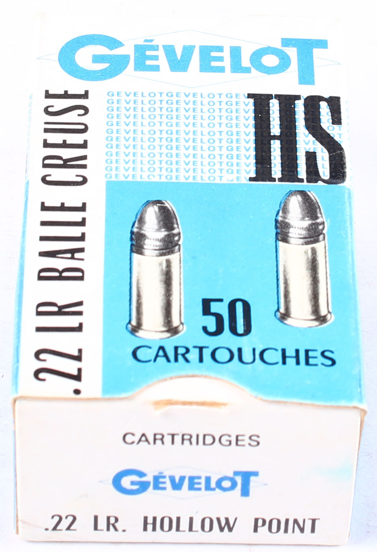 Gevelot, Balle Creuse, .22 Long Rifle Hollow Point, RHWEB: (France) G-8 LR-4, Full, 1pc. Blue & white box, box is near mint with excellent to minty color, very minor corner wear, edges are mostly crisp, end flaps are solid, ammo is excellent. Grade: Excellent + - Value: 8 to 16