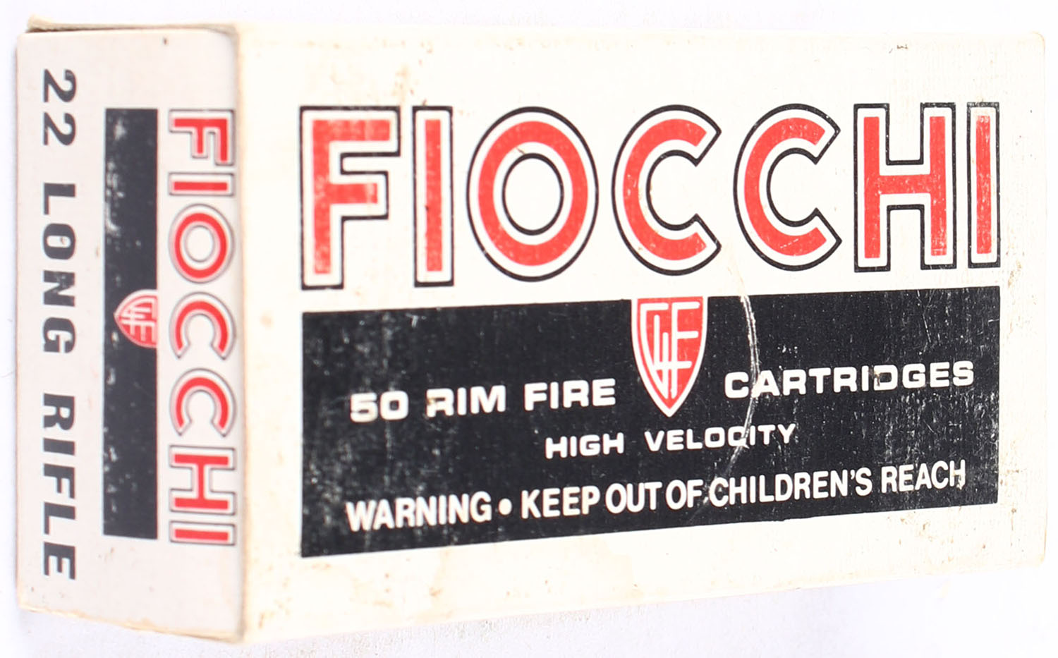 Fiocchi, Rim Fire Cartridges, .22 Long Rifle, High Velocity, RHWEB: (Canada) FIO-1 LR-1, Full, 1pc. White black & red box, box is solid with good color, minor age soiling, staining, corners are mostly sharp, edges are crisp, end flaps are solid, ammo is excellent. Grade: Very Good + - Value: 6 to 12