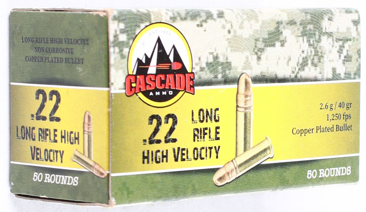 Cascade, .22 Long Rifle, High Velocity, 40 Gr. Copper Plated Bullet, Not in RHWeb, 1pc. Camo & yellow box, box is near mint with minty color, only very minor corner wear, edges are crisp, end flaps are solid, ammo is minty. Grade: Excellent ++ - Value: 6 to 10